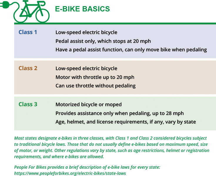 But the free-for-all in regulation is changing. About half of states, have followed the lead of California in creating regulations based on a three-tier classification framework that considers differences in how e-bikes are used and their range of speeds and capabilities. [See graphic above,