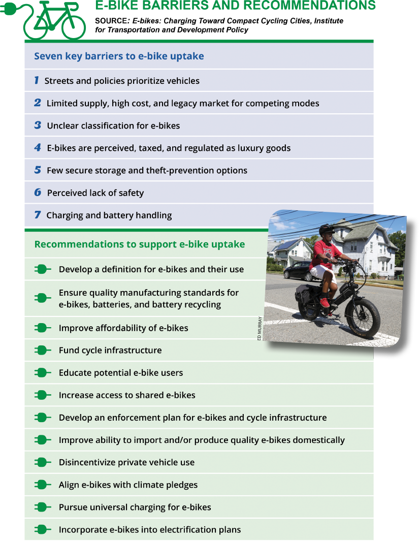 "Many countries and cities have not yet clearly defined what e-bikes are, what quality standards they must meet, and/or where they can be used. This lack of clarity has led to safety concerns around conflicts between people on e-bikes and other street users, deadly e-bike battery fires, and other challenges," according to ITDP’s