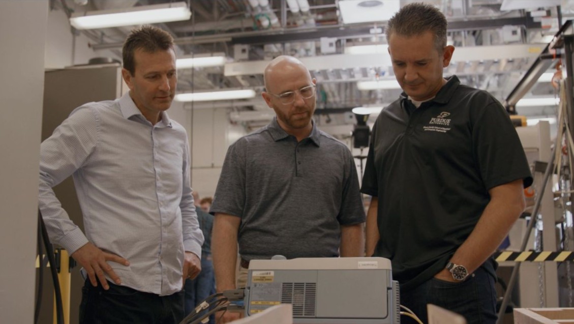 In a Purdue electrical engineering lab, Steve Pekarek, Aaron Brovont and Dionysios Aliprantis measure the electromagnetic performance of coils they are developing to transmit power to receiver coils on electric vehicles as they drive. Consensus Digital Media